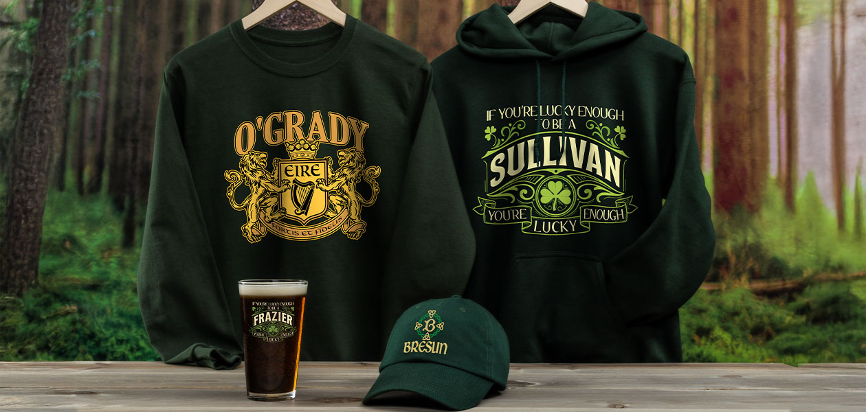 Irish shirts, pint glasses, wooden coasters, and more help you showcase your Irish culture and family pride. Declare your love for Ireland with personalized Irish apparel, including shirts, sweatshirts, hats, and more. Personalize any of these great Irish designs for yourself or for the whole family! If you love these designs, be sure to check out all of our lucky personalized shirts!