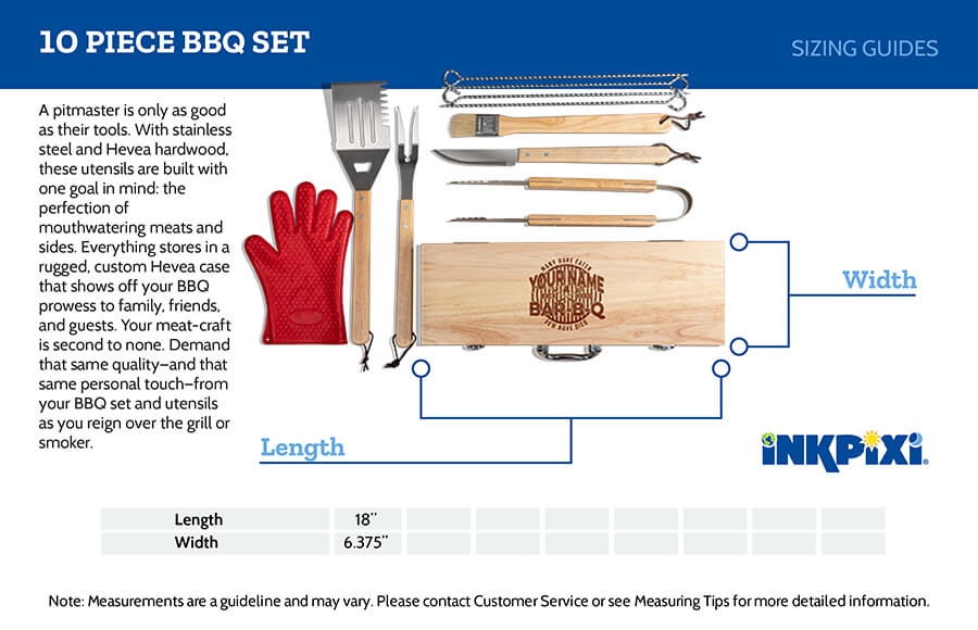 Grilling is an art, and like any artist you need the proper tools to create something truly breathtaking. Our custom engraved 10-piece BBQ set has everything you need to cook up your flame-kissed masterpieces of meat. People flock to your place for signature briskets, steaks, and burgers – put that same personal touch on your BBQ set and get back to the grill!